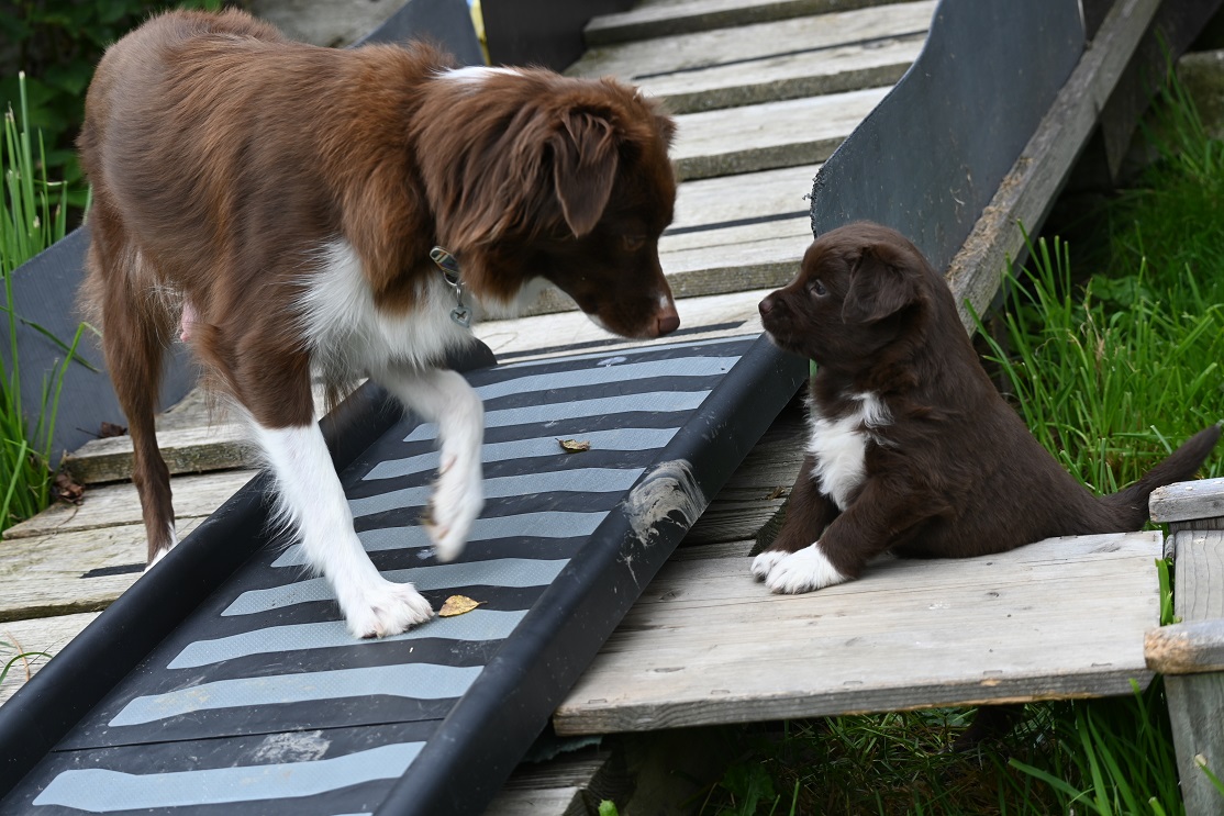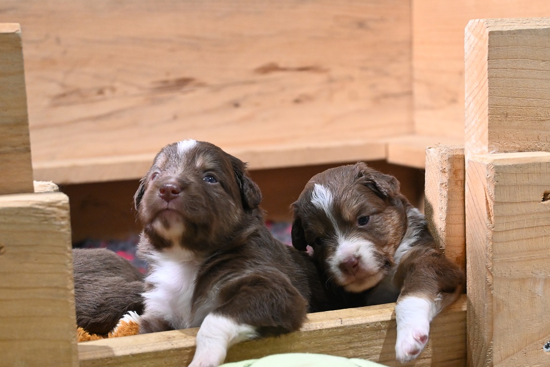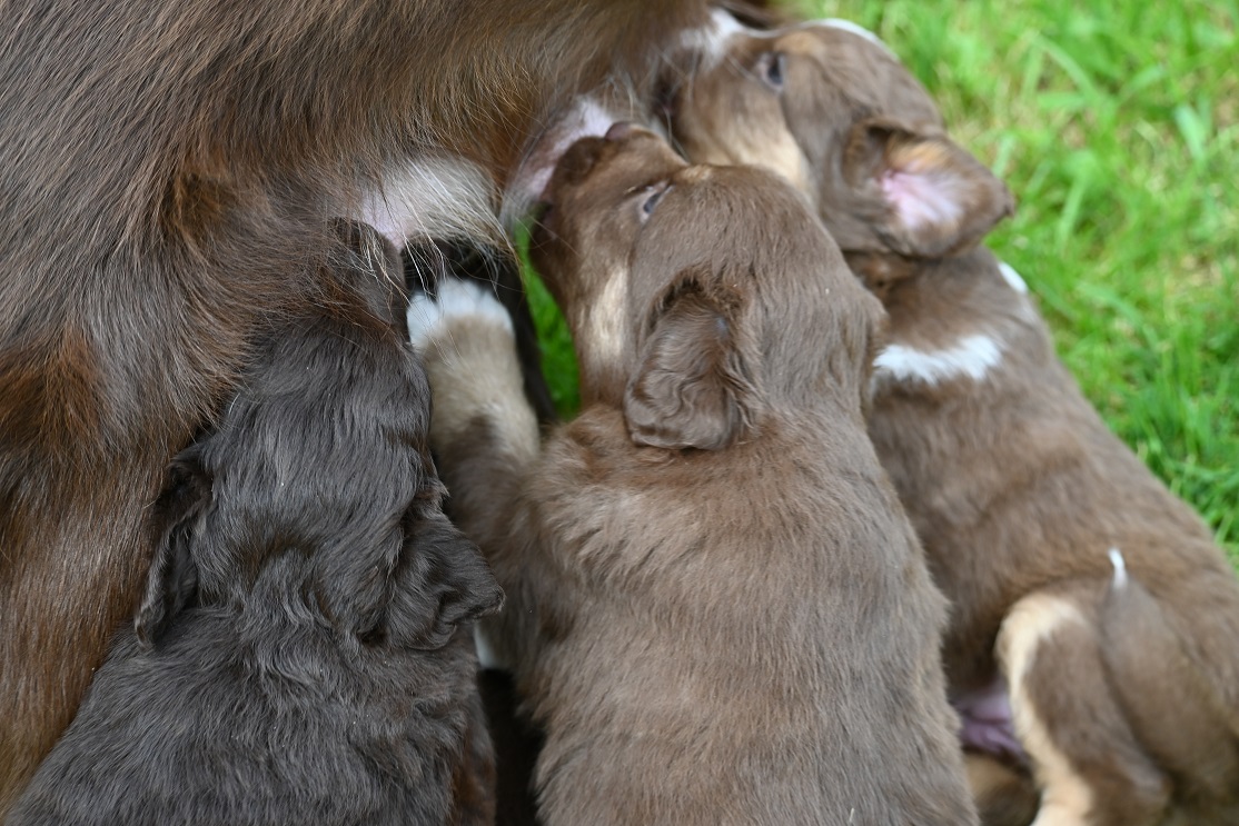 Die Welpen dürfen ab ca der 5.Woche besucht werde, bei der Abgabe sind die Welpen mindestens 9 Wochen alt, entwurmt, gechipt und werden 1 x geimpft -bekommen einen EU - Heimtierausweis und werden von der Augenspezialistin gecheckt, der Wurf wird vom Zuchtwart oder Tierarzt kontrolliert und wenn alles gut ist erhalten sie ihre Abstammungsurkunde vom Schweizerischen Rassehunde Zuchtverband SRZ/MASCS, unsere Welpen bekommen ein Welpenstarterpaket mit Halsband, Geschirr, Leine und Schleppleine, Futter für die erste Zeit und natürlich eine kleine Decke die nach der Mutter und Geschwister riecht.